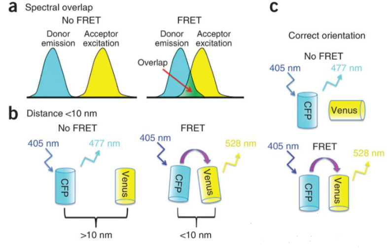 荧光共振能量转移(FRET) 高等分析化学 | 2022-5-16 17:28 251 字 | 1 分钟内 本文最后更新于117 天前,其中的信息可能已经过时,如有错误请发送邮件到lxg55553@163.com 荧光共振能量转移(FRET) 指两个荧光发色基团在足够靠近时(小于 100 埃), 当供体分子(donnor)吸收一定频率的光子后 被激发到更高的电子能态,在该电子回到基态前,通过偶极子相互作用,实现了能量向邻近的受体分子(acceptor)转移该放光没放光,被旁边吸收,放出旁边物质的光 FRET发生条件 此过程为非辐射的,因为没有光子的参与发生有效能量转移的条件是苛刻的:(1)Donor 和 Acceptor 的吸收光谱一定是重叠的(2)二者的荧光色团必须以适当方式排列,方向一致比如 C 中的第一幅图不可以发生 FRET(3)必须足够接近,小于 10nm,如 b 图,这样发生能量转移的几率才会高 文末附加内容