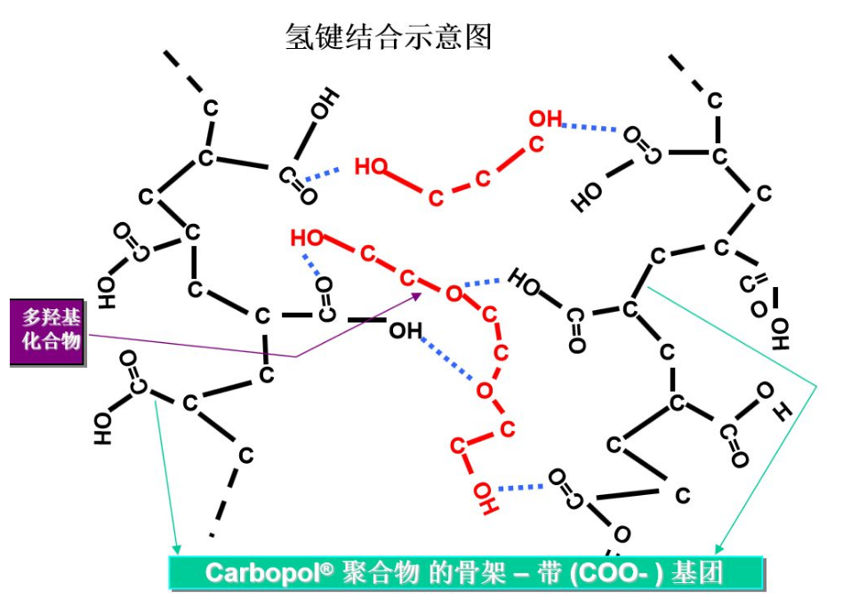 卡波姆分子作为羧基给予体,能与一个或两个以上羟基结合形成氢键而增稠,这种反应机理需要时间。常用的羟基给予体有非离子型表面活性剂、多元醇等。