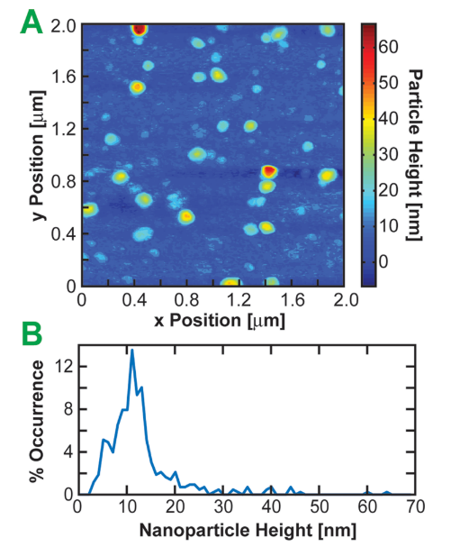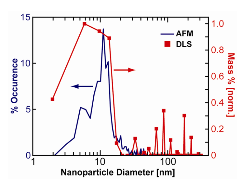可以从AFM的图B看出,粒径11nm的地方有一个峰。与DLS图相符合