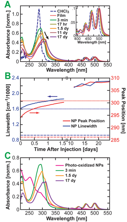 随后,进行了稳态光谱吸收的测试,通过了对溶解于氯仿、薄膜相、不同时间后的水相DPT NPs的比较。可以看出随着时间的推移,吸收峰从290nm波长左右红移,与纳米晶吸收降低的事实相符。
