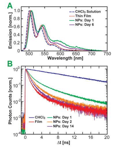 作者还对DPT NPs的稳态发射光谱进行表征。可以看出,薄膜相和氯仿溶液中的DPT在550nm之前的吸收都比较相似。但是在600nm之后,NPs有更高的发射峰,作者将这种红移发射归纳为三重态对缺陷处的单重态激子的发射。
