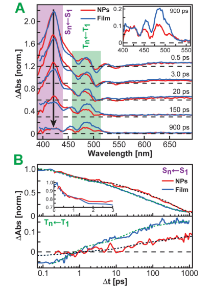 后面作者用瞬态吸收光谱(TA)对NPs进行表征,可以很明显的看出随着时间的增加,单重态(410~430nm)的吸收峰在逐渐减小(衰减),三重态(490~510nm)的吸收峰在逐渐增加。同样的现象在薄膜相也有,且薄膜相的速度更快。这里的单重态和三重态的系列变化是同时进行的,故可以归属为SF。