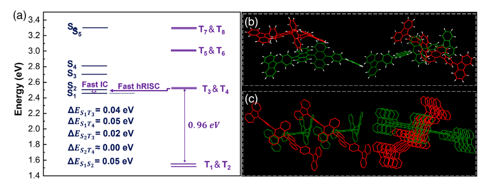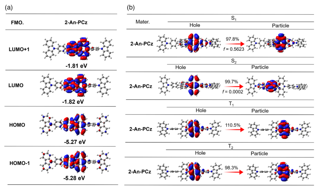 高效的 “热激子” 机制: 2An-PCz 具有多个高能级反系间窜越 (hRISC) 通道和大的前线分子轨道 (FMO) 重叠,这促进了快速 hRISC 过程并增强了辐射跃迁速率。