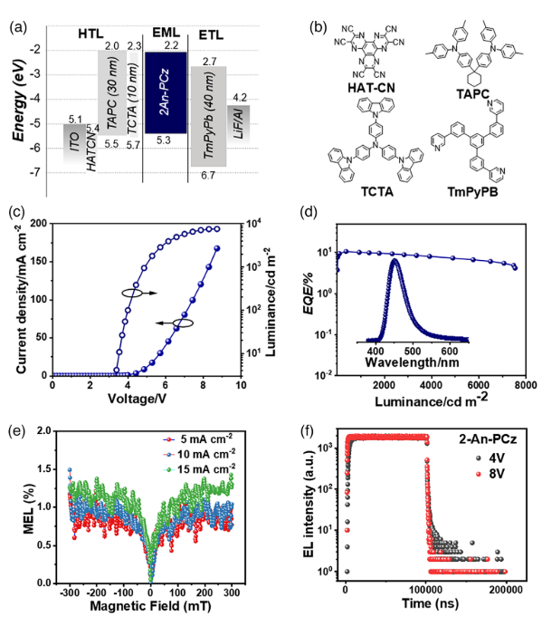 磁场实验和瞬态电致发光测量表明,”热激子” 机制是 2An-PCz 发光的主要机制,而非三重态湮灭 (TTA) 机制。